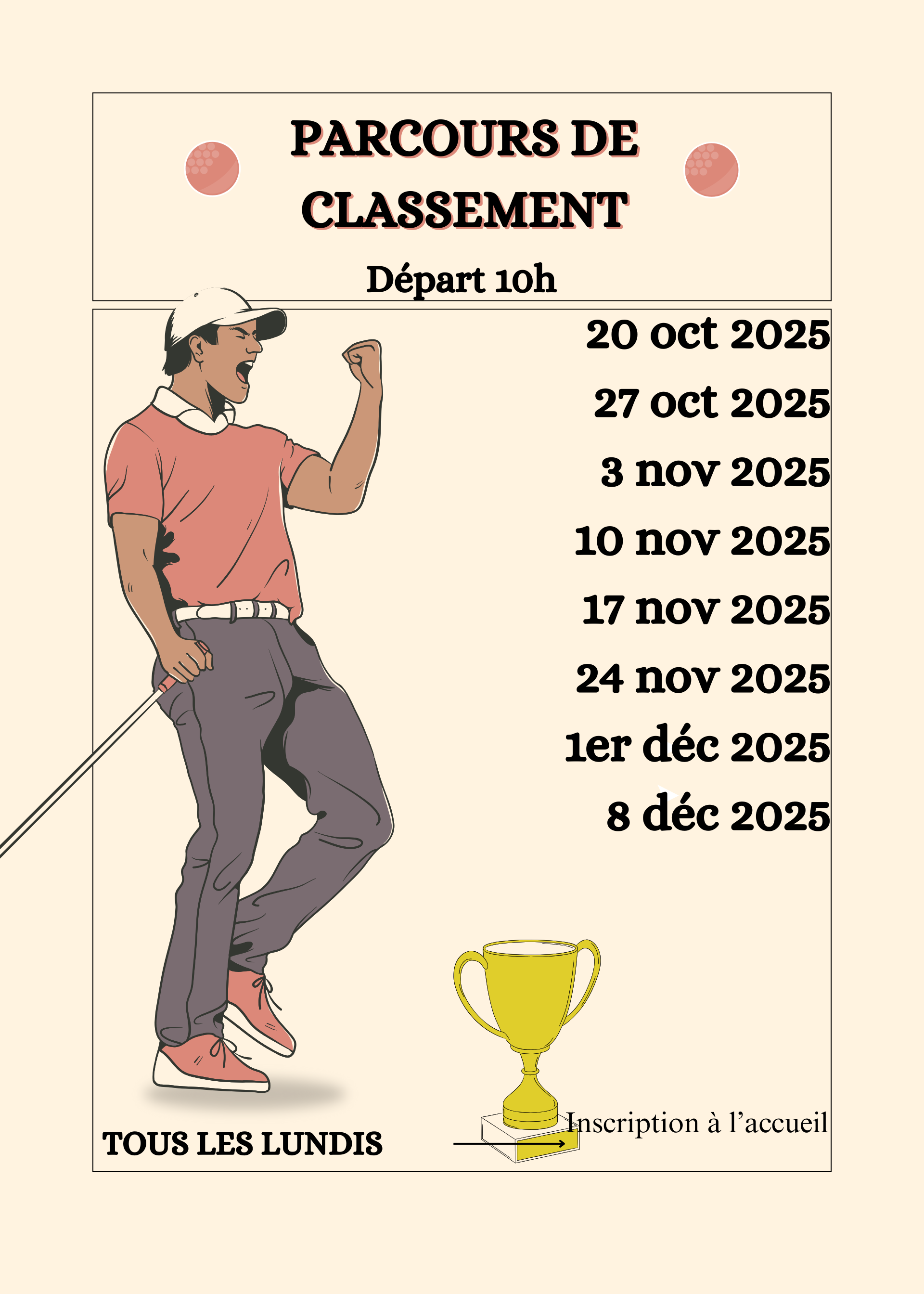 DÉPART HIVER ET GREEN D'HIVER (selon météo) OBLIGATOIRES A PARTIR DU LUNDI 24 NOVEMBRE 2025. MERCI POUR VOTRE COMPRÉHENSION.