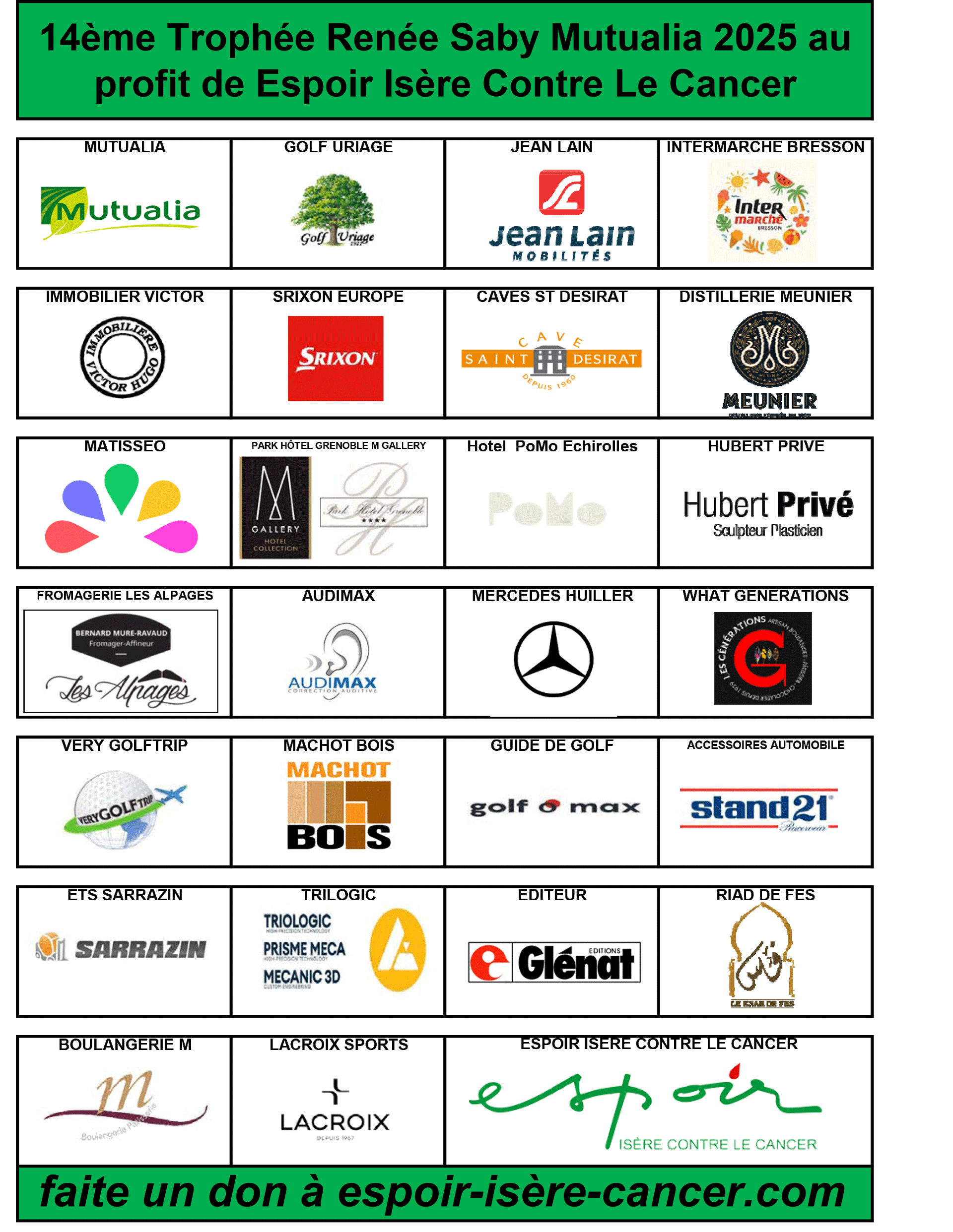 Partenaires officiels : Mutualia, Jean Lain mobilités, Intermarché Bresson, Srixon Europe, Immobilière Victor Hugo, Cave Saint Désirat, Hubert Privé, Matisseo, Golf d'Uriage.