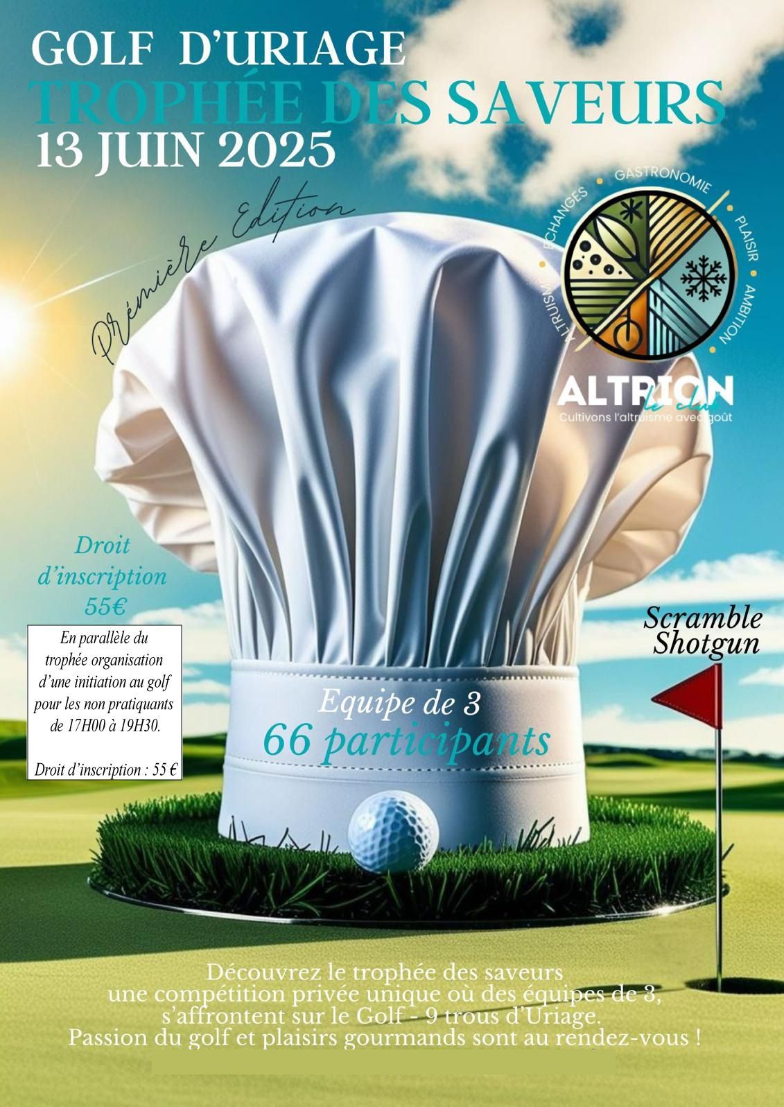 17H00 - 19H30 - 9 trous - Scramble à 3 dont 1 néophyte qui participera au putting.